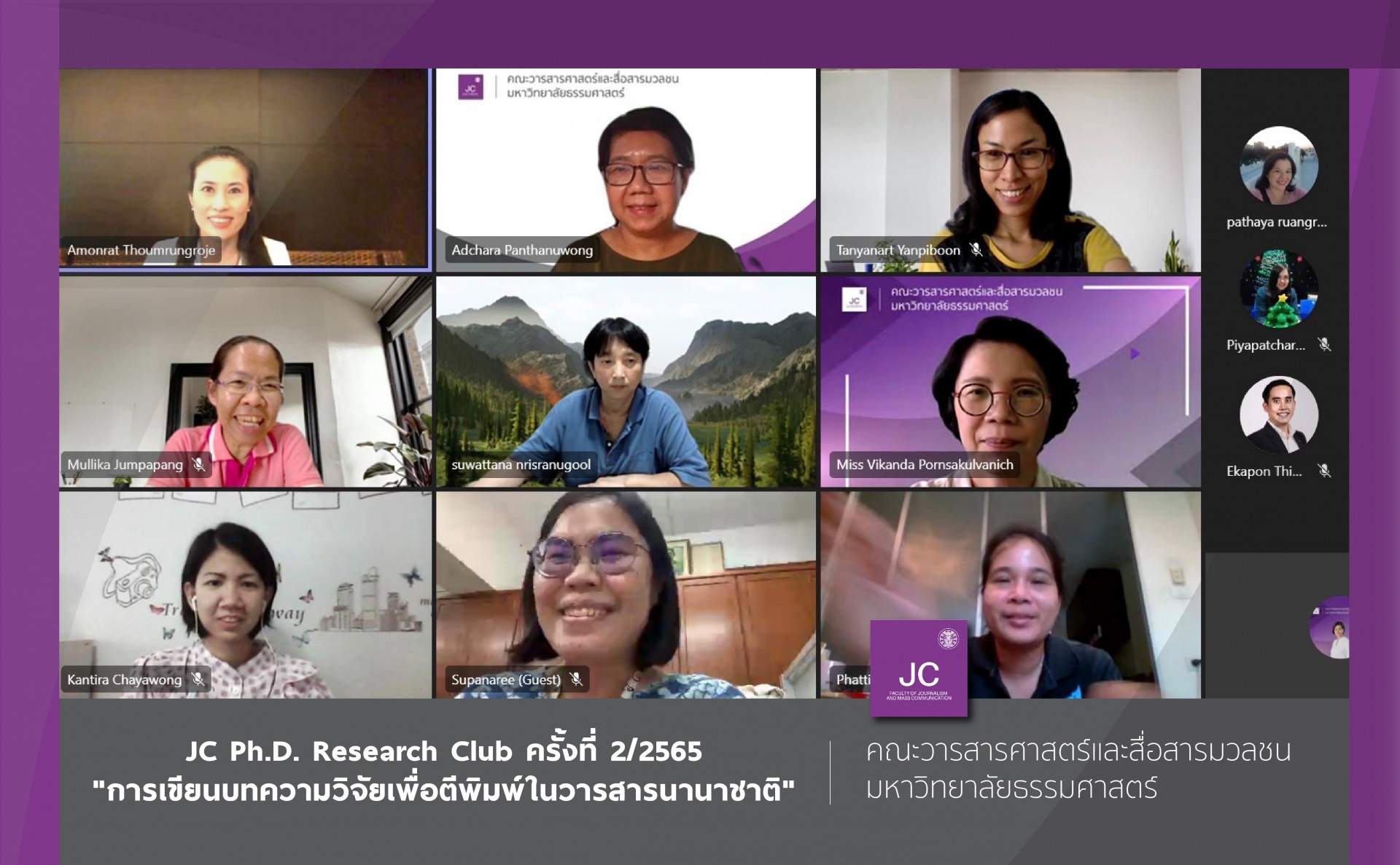 เมื่อวันที่ 19 เมษายน 2565 หลักสูตรปรัชญาดุษฎีบัณฑิต สาขาวิชาสื่อและการสื่อสาร จัดงาน JC Ph.D. Research Club ครั้งที่ 2/2565 ในหัวข้อ "การเขียนบทความวิจัยเพื่อตีพิมพ์ในวารสารนานาชาติ" ทางออนไลน์ผ่านระบบ Microsoft Teams โดยได้รับเกียรติจาก ผศ.ดร.อมรรัตน์ ท้วมรุ่งโรจน์ อาจารย์ประจำวิทยาลัยนานาชาติ มหาวิทยาลัยมหิดล เป็นวิทยากรบรรยายในครั้งนี้ การอบรมดังกล่าวจัดขึ้นเพื่อเป็นพื้นที่สำหรับการแลกเปลี่ยนเรียนรู้ร่วมกันระหว่างอาจารย์ วิทยากรและนักศึกษาระดับปริญญาเอก รวมถึงการให้คำปรึกษาด้านการวิจัยเพื่อนำไปปรับใช้และพัฒนางานด้านการเรียนการสอนในการศึกษาวิทยานิพนธ์ดุษฎีบัณฑิต และเป็นกลไกในการขับเคลื่อนให้นักศึกษาในหลักสูตรปรัชญาดุษฎีบัณฑิต มีทักษะการเขียนบทความวิจัยเพื่อตีพิมพ์ในวารสารนานาชาติ โดยมี รศ.ดร.วิกานดา พรสกุลวานิช กรรมการผู้รับผิดชอบหลักสูตรปรัชญาดุษฎีบัณฑิต เป็นผู้ดำเนินรายการ