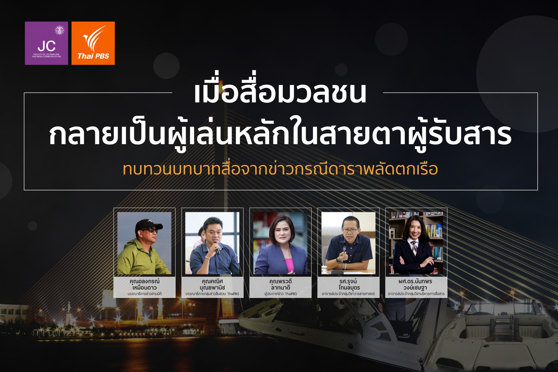 คณะวารสารศาสตร์และสื่อสารมวลชน มหาวิทยาลัยธรรมศาสตร์ ได้จัดเสวนาวิชาการ ในหัวข้อ “เมื่อสื่อมวลชนกลายเป็นผู้เล่นหลักในสายตาผู้รับสาร : ทบทวนบทบาทสื่อจากข่าวกรณีดาราพลัดตกเรือ” โดยได้รับเกียรติจาก รศ.กัลยกร วรกุลลัฎฐานีย์ คณบดีคณะวารสารศาสตร์และสื่อสารมวลชน กล่าวเปิดงาน ภายในงานมีผู้เชี่ยวชาญด้านสื่อสารมวลชน มาร่วมแสดงความเห็น วิทยากรประกอบด้วย คุณอลงกรณ์ เหมือนดาว บรรณาธิการข่าวสามมิติ คุณคณิศ บุณยพานิช บรรณาธิการกลุ่มข่าวสืบสวน ThaiPBS คุณพรวดี ลาทนาดี ผู้ประกาศข่าว ThaiPBS รศ.รุจน์ โกมลบุตร อาจารย์ประจำกลุ่มวิชาวารสารศาสตร์ และผศ.ดร.นันทพร วงษ์เชษฐา อาจารย์ประจำกลุ่มวิชาบริหารการสื่อสาร