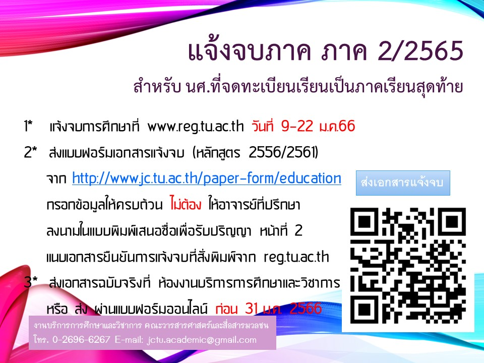- ภาคเรียนที่ 2/2565 แจ้งจบในระบบของสำนักงานทะเบียน ระหว่างวันที่ 9-22 มกราคม 2566