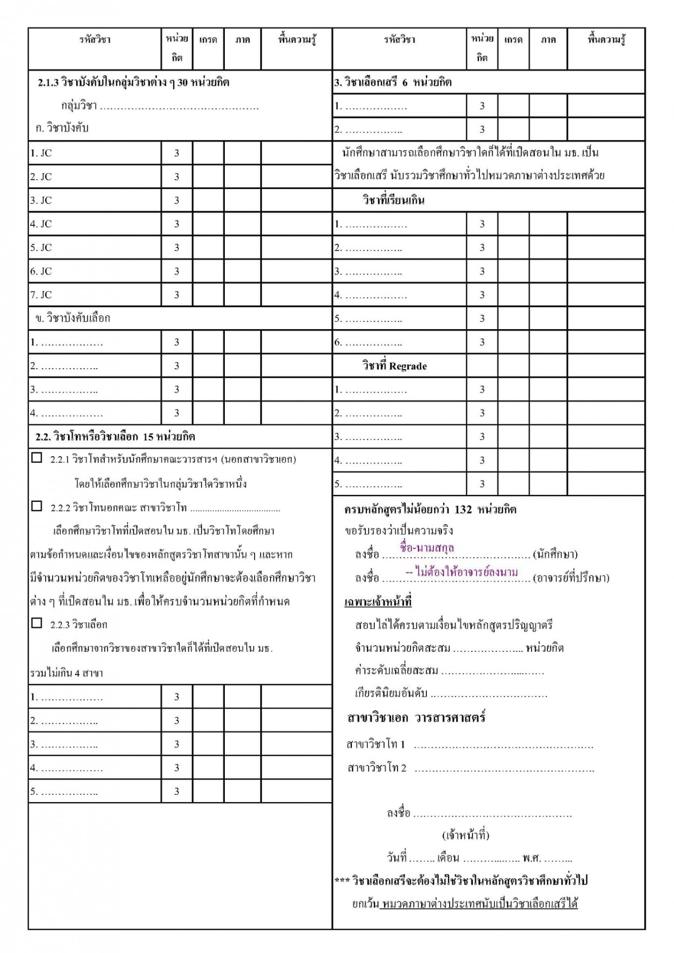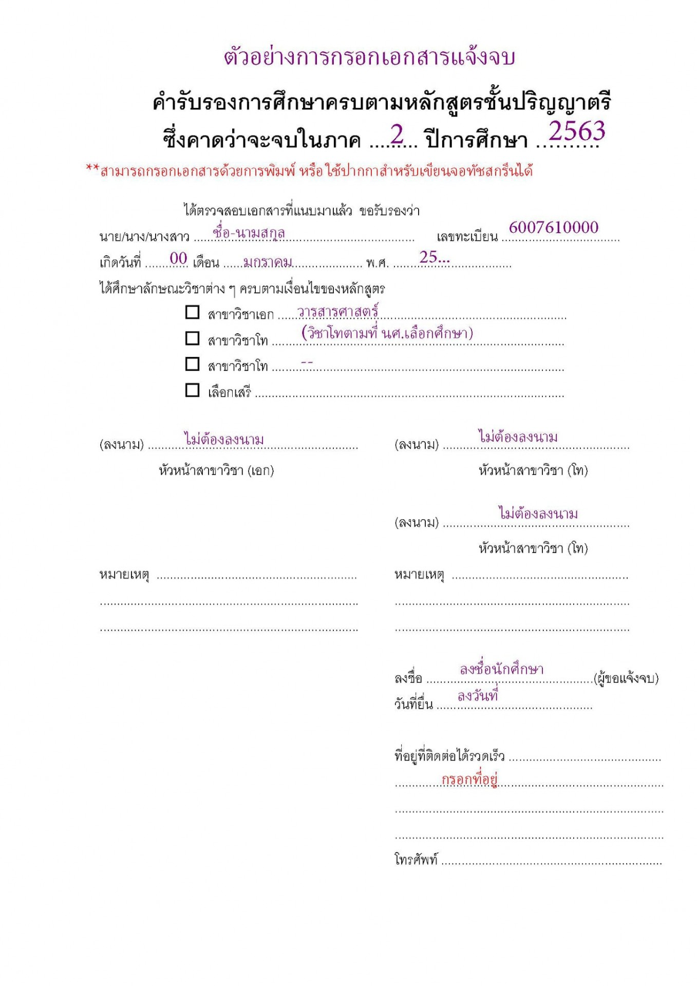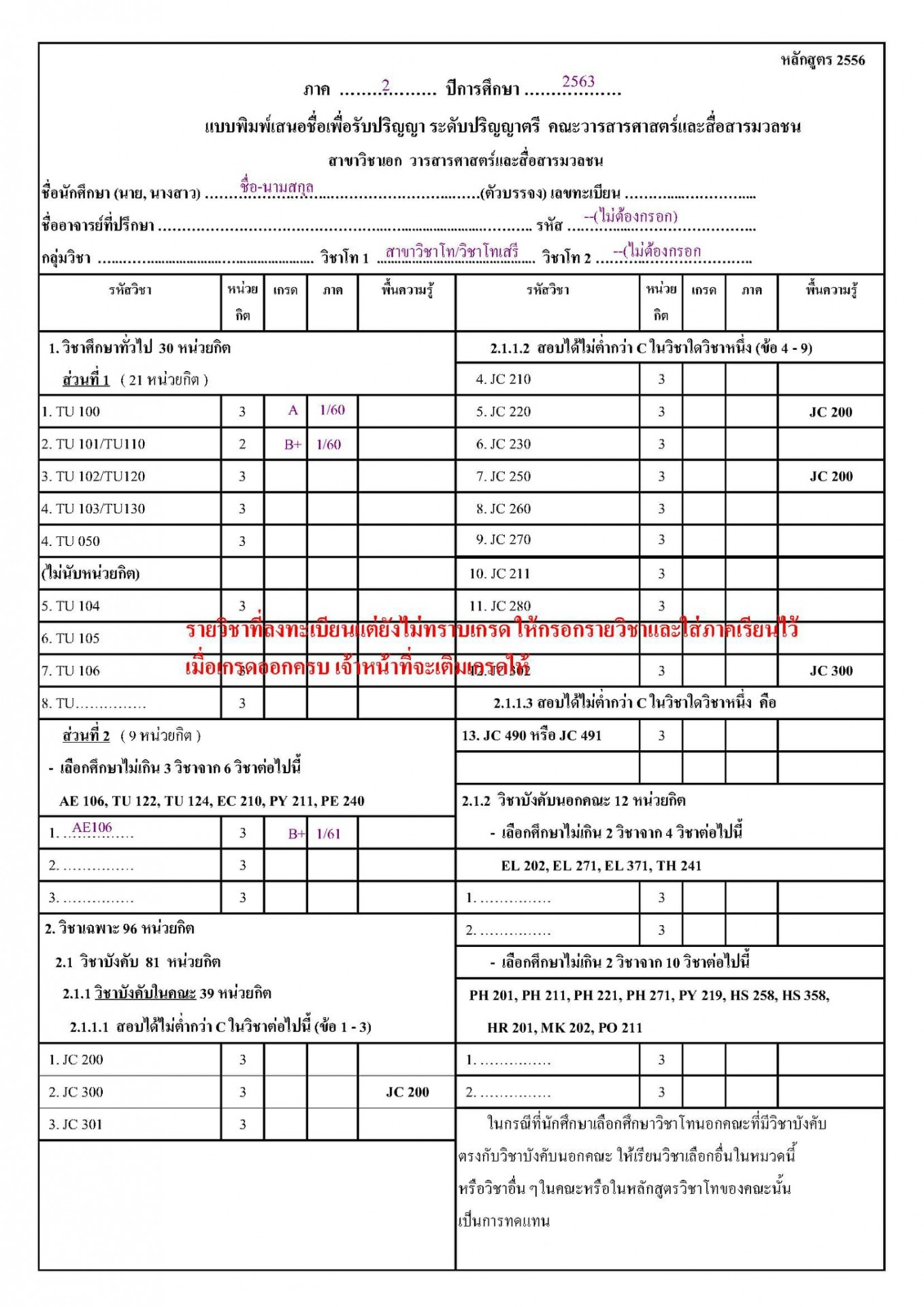 2* ส่งแบบฟอร์มเอกสารแจ้งจบ (หลักสูตร 2556-2561) จาก เอกสารแจ้งจบ หลักสูตร 2561 หรือ http://www.jc.tu.ac.th/paper-form/education กรอกข้อมูลให้ครบถ้วนไม่ต้อง ให้อาจารย์ที่ปรึกษาลงนามในแบบพิมพ์เสนอชื่อเพื่อรับปริญญา หน้าที่ 2 พร้อมแนบเอกสารยืนยันการแจ้งจบการศึกษาที่สั่งพิมพ์จาก reg.tu.ac.th