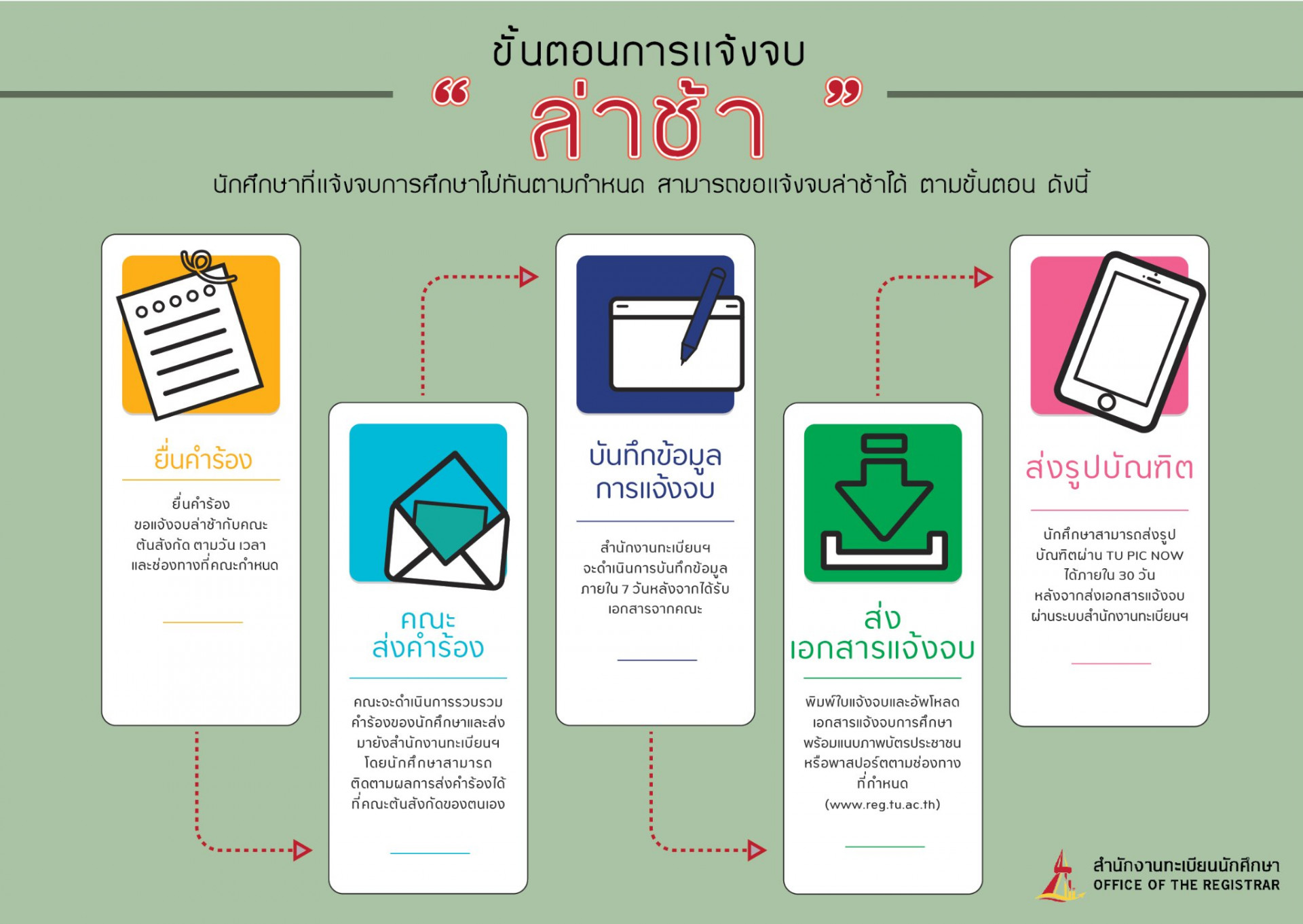 1* แจ้งจบการศึกษาที่ www.reg.tu.ac.th ตามขั้นการแจ้งจบการศึกษา ตามวันและเวลาที่ประกาศในปฏิทินการศึกษาของสำนักงานทะเบียน https://www.reg.tu.ac.th/th/post/read/686
