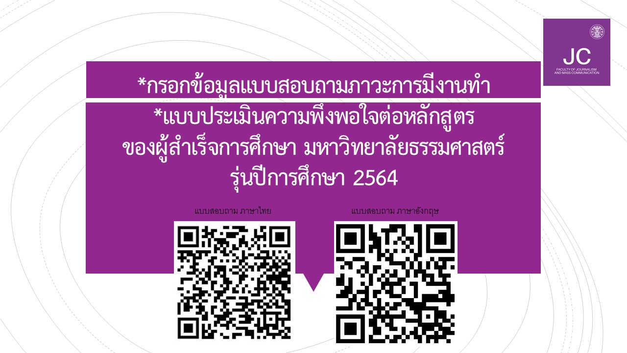 เรียน บัณฑิตคณะวารสารศาสตร์และสื่อสารมวลชน รุ่นปีการศึกษา 2564 ทุกท่าน ทั้งโครงการภาคปกติ (JC) และหลักสูตรนานาชาติ (BJM)
