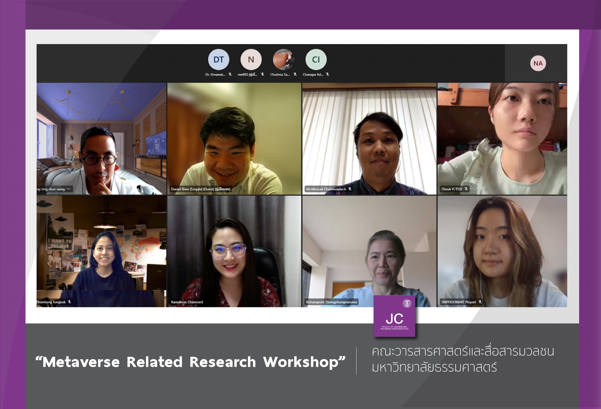 เมื่อวันที่ 1 สิงหาคม 2565 ฝ่ายวิจัย คณะวารสารศาสตร์ฯ จัดอบรมในหัวข้อ "Metaverse Related Research Workshop" ผ่านระบบออนไลน์ Microsoft Teams โดยได้รับเกียรติจาก รศ.กัลยกร วรกุลลัฎฐานีย์ คณบดีคณะวารสารศาสตร์ฯ ร่วมกล่าวเปิดงาน การจัดอบรมในครั้งนี้ได้รับเกียรติจาก อ.เรย์ ถิง-ชุน หว่อง อาจารย์ประจำหลักสูตรนานาชาติ Mr.Daniel Shen, Cjief Executive Officer, Soqqle และ Assist.Prof.Paulina Wong, The Science Unit, Lingnan University ร่วมเป็นวิทยากรบรรยาย โครงการดังกล่าวจัดขึ้นเพื่อให้ผู้เข้าร่วมอบรมมีความรู้ความเข้าใจเกี่ยวกับเมตาเวิร์ส (Metaverse) และงานวิจัยที่เกี่ยวข้องกับเมตาเวิร์ส รวมทั้งเผยแพร่องค์ความรู้ให้แก่คณาจารย์ นักศึกษาระดับบัณฑิตศึกษา และเจ้าหน้าที่เพื่อนำไปปรับใช้ในการทำงานและการทำวิจัยในอนาคต