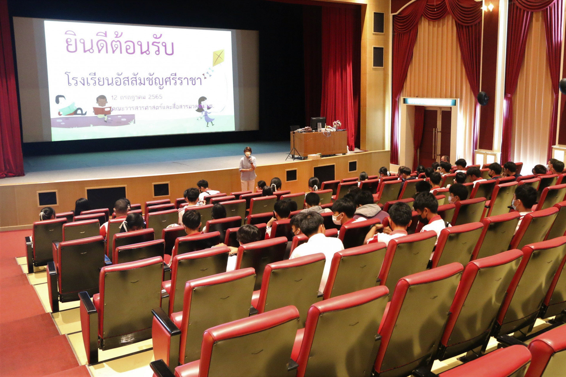 เมื่อวันที่ 12 กรกฎาคม 2565 รศ.ดร.นิธิดา แสงสิงแก้ว รองคณบดีฝ่ายวิชาการ พร้อมด้วยนางปิยาพัชร คนชม หัวหน้างานงานบริการการศึกษาและวิชาการ ร่วมกล่าวตอนรับนักเรียนจากโรงเรียนอัสสัมชัญศรีราชา จังหวัดชลบุรี ณ โรงภาพยนตร์ JC CINEMA คณะวารสารศาสตร์และสื่อสารมวลชน มหาวิทยาลัยธรรมศาสตร์ ศูนย์รังสิต ภายในงานได้รับเกียรติจาก อาจารย์ซาช่า ฮอสส์ ฟังก์ หัวหน้าสาขาวิชาสื่อศึกษา หลักสูตรนานาชาติ (B.J.M.) และคุณจารุณี สุขสม หัวหน้าหมวดปริญญาตรีและการนักศึกษา ร่วมเป็นวิทยากรบรรยายและแนะแนวการเข้าศึกษาต่อระดับอุดมศึกษาให้แก่นักเรียนจากโรงเรียนอัสสัมชัญศรีราชา จังหวัดชลบุรี เพื่อสร้างการรับรู้และสร้างความเข้าใจเกี่ยวกับหลักสูตรต่างๆ ของคณะวารสารศาสตร์ฯ ทั้งหลักสูตรภาษาไทยและหลักสูตรนานาชาติ (B.J.M.)