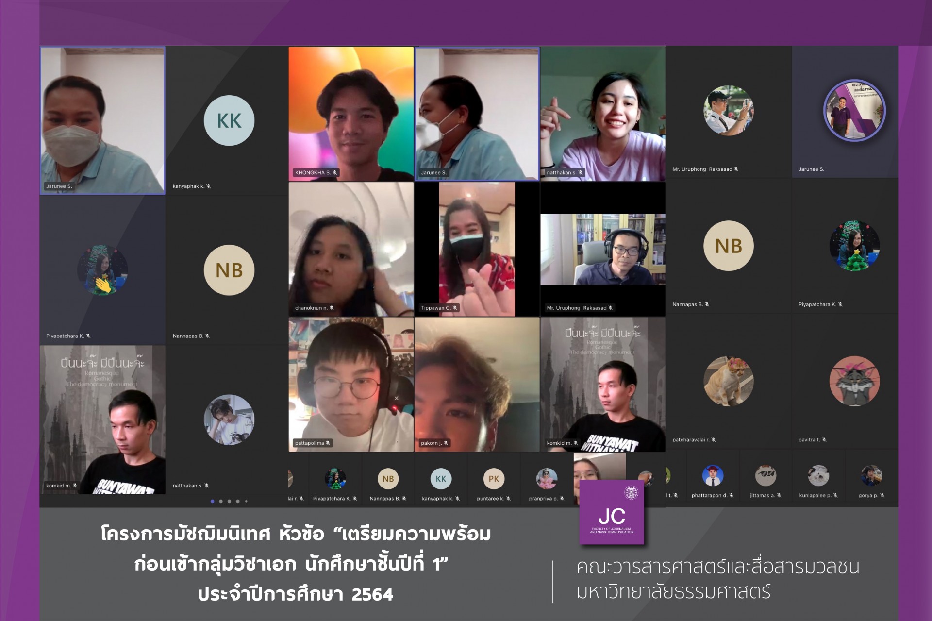 เมื่อวันที่ 29 เมษายน 2565 งานบริการการศึกษาและวิชาการ คณะวารสารศาสตร์และสื่อสารมวลชน จัดโครงการมัชฌิมนิเทศ หัวข้อ“เตรียมความพร้อมก่อนเข้ากลุ่มวิชาเอก นักศึกษาชั้นปีที่ 1” ประจำปีการศึกษา 2564 ในรูปแบบออนไลน์ผ่านระบบ Microsoft Teams โดยมี รศ.ดร.นิธิดา แสงสิงแก้ว รองคณบดีฝ่ายวิชาการ พร้อมด้วยหัวหน้ากลุ่มวิชา คณาจารย์และเจ้าหน้าที่ ร่วมให้คำแนะนำเกี่ยวกับข้อมูลในด้านต่างๆ เพื่อประกอบการตัดสินใจในการเลือกกลุ่มวิชา โครงการดังกล่าวจัดขึ้นเพื่อให้นักศึกษาสามารถตัดสินใจเลือกเรียนกลุ่มวิชาต่าง ๆ ได้ตรงตามความถนัดและความสนใจ เพื่อวางแผนการเรียนตามข้อกำหนดของหลักสูตรวารสารศาสตรบัณฑิตและกำหนดบทบาทของตนเองในการศึกษา การเข้าร่วมกิจกรรม และอื่น ๆ
