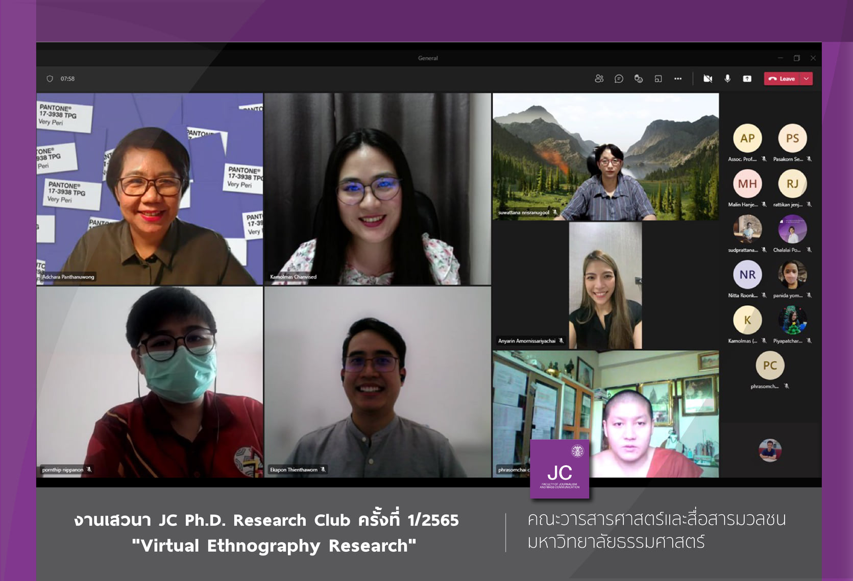 เมื่อวันที่ 22 กุมภาพันธ์ 2565 หลักสูตรปรัชญาดุษฎีบัณฑิต สาขาวิชาสื่อและการสื่อสาร จัดงานเสวนา JC Ph.D. Research Club ครั้งที่ 1/2565 ในหัวข้อ "Virtual Ethnography Research" ทางออนไลน์ผ่านระบบ Microsoft Teams โดยได้รับเกียรติจาก อ.กมลมาศ ชาญวิเศษ อาจารย์ประจำกลุ่มวิชาบริหารการสื่อสาร เป็นวิทยากรในการเสวนาครั้งนี้ การเสวนาดังกล่าวจัดขึ้นเพื่อเป็นพื้นที่สำหรับการแลกเปลี่ยนเรียนรู้ร่วมกันระหว่างอาจารย์ วิทยากรและนักศึกษาระดับปริญญาเอก รวมถึงการให้คำปรึกษาและองค์ความรู้ด้านการวิจัยเพื่อนำไปปรับใช้และพัฒนางานด้านการเรียนการสอนในการศึกษาวิทยานิพนธ์ดุษฎีบัณฑิต และเป็นกลไกในการขับเคลื่อนให้นักศึกษาในหลักสูตรปรัชญาดุษฎีบัณฑิต ได้ทำงานวิจัยตามแผนการศึกษาที่หลักสูตรกำหนด ซึ่งจะนำไปสู่การพัฒนางานของนักศึกษาและอาจารย์ต่อไป