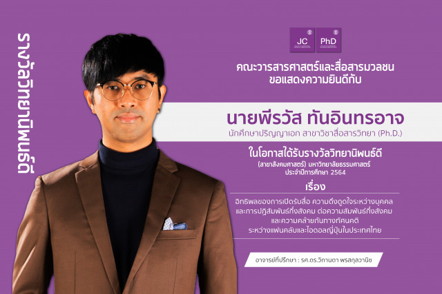 คณะวารสารศาสตร์และสื่อสารมวลชน ขอแสดงความยินดีกับ นายวิภัทร เลิศภูริวงศ์ นักศึกษาปริญญาโท สาขาวิชาการบริหารสื่อสารมวลชน (MCA) ในโอกาสได้รับรางวัลวิทยานิพนธ์ดี (สาขาสังคมศาสตร์) มหาวิทยาลัยธรรมศาสตร์ ประจำปีการศึกษา 2564 จากวิทยานิพนธ์เรื่อง "ปัจจัยในการยอมรับเทคโนโลยี ทัศนคติและอิทธิพลทางสังคม ทำนายความตั้งใจในการใช้งานแอปพลิเคชันโรงพยาบาลภาครัฐ" โดยมี รศ.ดร.วิกานดา พรสกุลวานิช อาจารย์ประจำกลุ่มวิชาบริหารการสื่อสาร เป็นอาจารย์ที่ปรึกษา