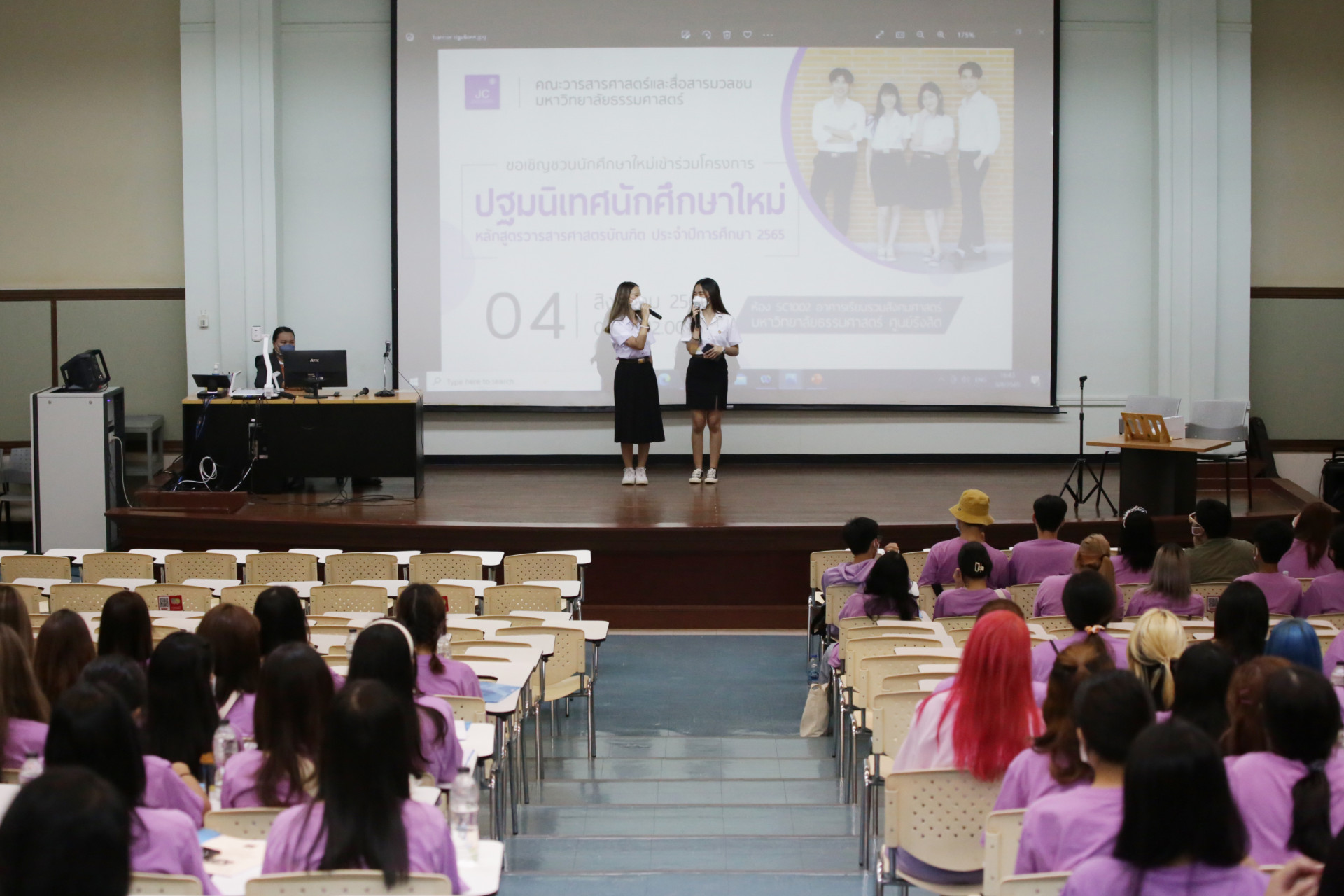เมื่อวันที่ 4 สิงหาคม 2565 คณะวารสารศาสตร์ฯ จัดกิจกรรม “ปฐมนิเทศนักศึกษาใหม่ หลักสูตรวารสารศาสตรบัณฑิต ประจำปีการศึกษา 2565” ณ ห้อง SC1002 อาคารเรียนรวมสังคมศาสตร์ มหาวิทยาลัยธรรมศาสตร์ ศูนย์รังสิต โดยได้รับเกียรติจาก รศ.กัลยกร วรกุลลัฎฐานีย์ คณบดีคณะวารสารศาสตร์ฯ กล่าวเปิดงานและให้โอวาทแก่นักศึกษาใหม่