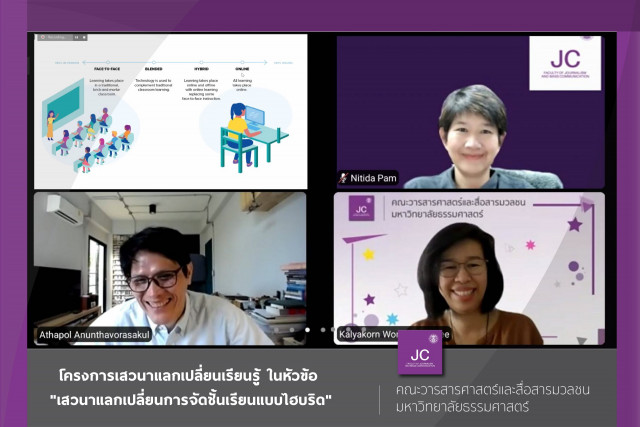 อ่านเพิ่มเติมเมื่อวันที่ 7 มกราคม 2565 ฝ่ายวิชาการ คณะวารสารศาสตร์ฯ จัดงานเสวนาแลกเปลี่ยนเรียนรู้ ในหัวข้อ "เสวนาแลกเปลี่ยนการจัดชั้นเรียนแบบไฮบริด" ผ่านระบบออนไลน...