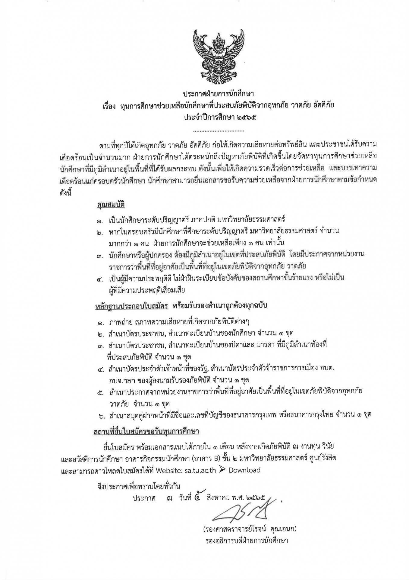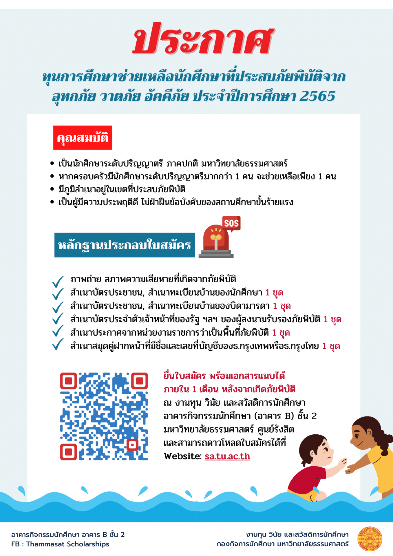ทุนการช่วยเหลือนักศึกษาที่ประสบภัยพิบัติจากอุทกภัย วาตภัย อัคคีภัย ประจำปีการศึกษา 2565