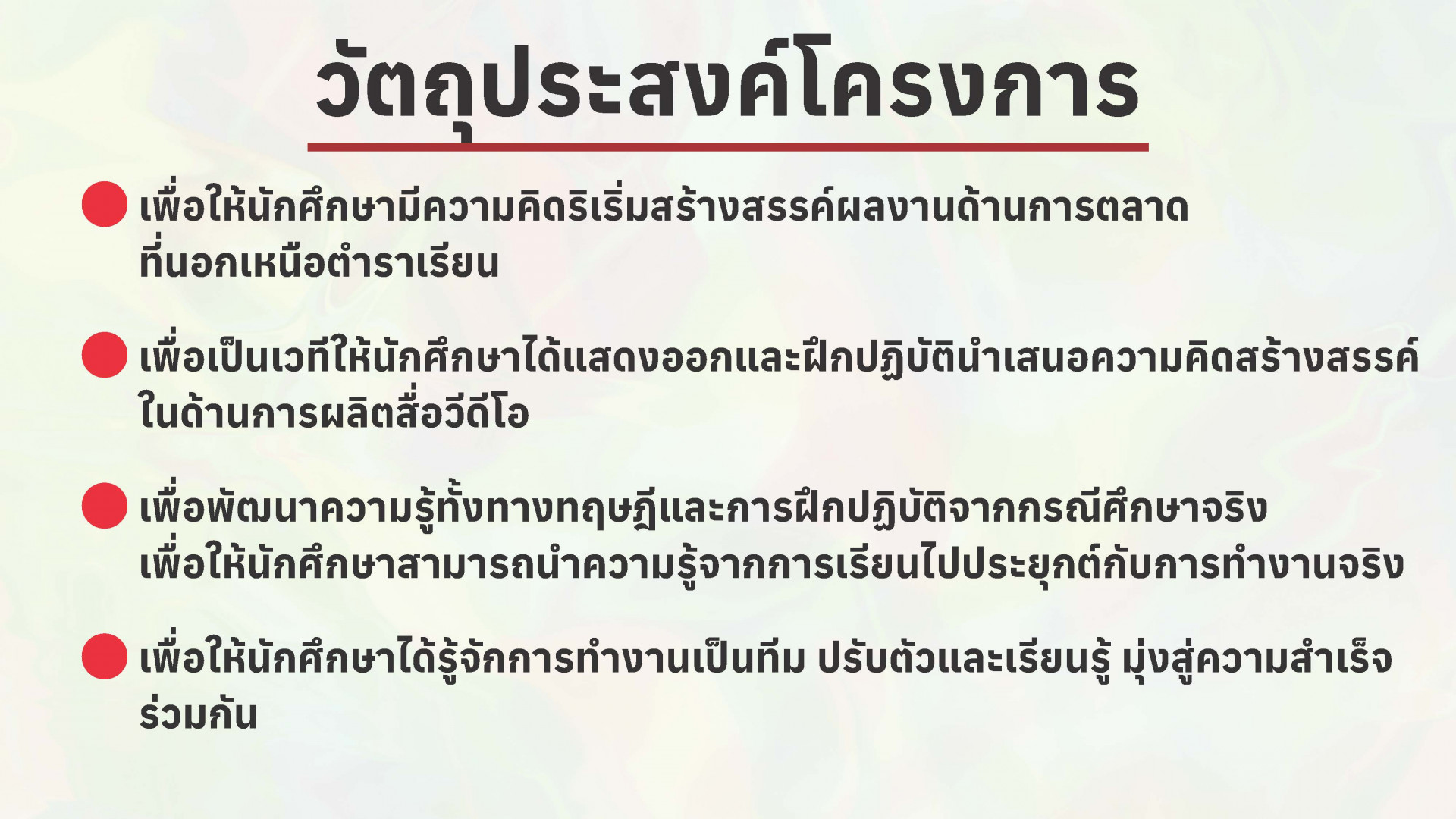 เพื่อพัฒนาความรู้ทางทฤษฎีและการฝึกปฏิบัติจากกรณีศึกษาจริง ซึ่งจะทำให้นักศึกษาได้ฝึกการทำงานร่วมกัน