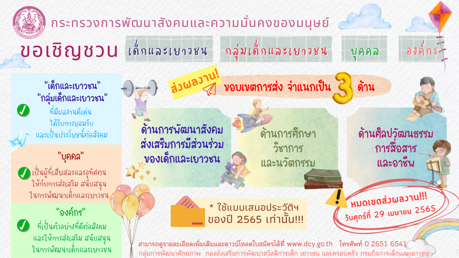 จะดำเนินการสรรหา พิจารณา คัดเลือก ประกาศยกย่องเด็กและเยาวชนดีเด่นแห่งชาติ และผู้ทำคุณประโยชน์ต่อเด็กและเยาวชน ประจำปี 2565 เพื่อเข้ารับพระราชทานรางวัลเด็กและเยาวชนดีเด่นแห่งชาติ และผู้ทำคุณประโยชน์ต่อเด็กและเยาวชน